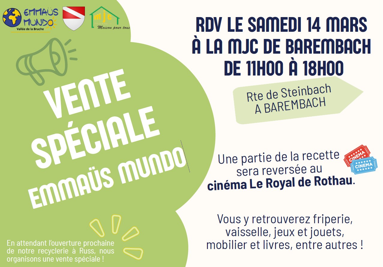 L’équipe d’Emmaüs Mundo Vallée de la Bruche organise une vente spéciale le samedi 14 mars, de 11h à 18h, dans les locaux de la MJC de Barembach.
